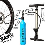 + Leak-proof and reliable threaded valves; + Simple and highly efficient operation; + Flow control; + Preparation with standard pump with presta valve tip; + The special valve tip to make your Tubeless tyres slammed every time! Here is an innovation that will make it talk about it and {{{site}} offers you exclusively ! This Airhot compressor pump from the brand of the same name is an amazing tool for fitting Tubeless tyres. It’s simple, but you had to think about this: this pump plays the role of a compressor without really being one, and allows you to mount your tubeless tyres in an instant, at home or even on the field. A special nozzle for presta valve (taking the place of the shell) increases the volume of air and ensures the success of your Tubeless mounts. The operation is simple: you pressurize the AirHOT pump with your usual pump, up to 9 bar (130 psi). Then you use the stored pressure when you need it. The very high air flow inflates and slams your Tubeless assembly in seconds. An accessory that has everything to become a must-have.