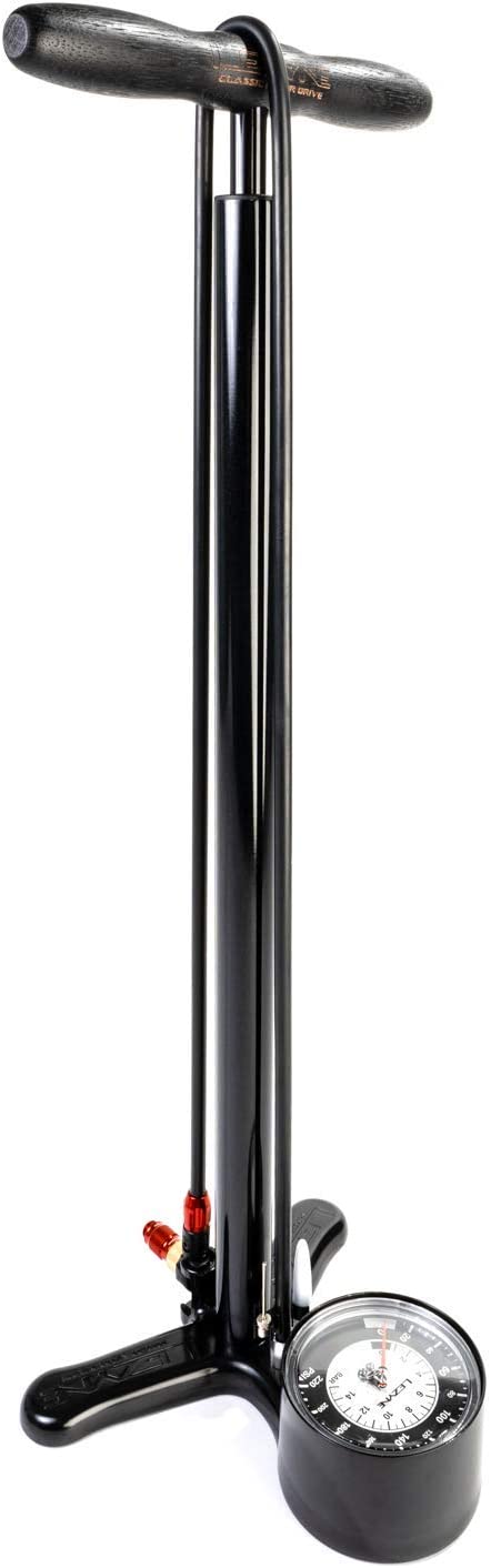 Lezyne Classic Floor Drive Bike Pump::Pump it up with Lezyne’s Classic Floor Drive Bike Pump. This precision high-pressure pump features a steel barrel and piston, varnished wood handle and aluminum base. The ABS Flip-Thread Chuck and 43″ | 130cm rubber hose easily reach both Presta and Schrader valves. An included Speed Chuck makes the pump compatible with disc wheels. The 2.5″ oversized gauge is precise and easy to read. Features a steel barrel coated with premium metallic paint that makes this pump as stylish as it is effective.