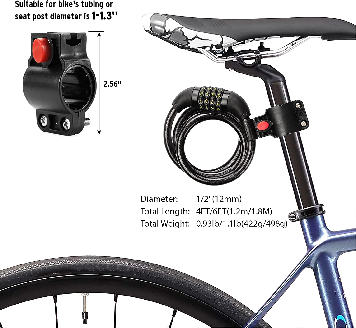 - SPECIFICATIONS: U-Lock interior locking dimensions are 3.25 in. x 6.25 in, 12mm steel shackle with a weight of 2 lbs. Bike lock security cable is 4 ft. (1.2 m) long and 5/16 in. (8 mm) wide in diameter. Includes two stainless steel keys with an ergonomic design to reduce torque and prevent bending or breaking